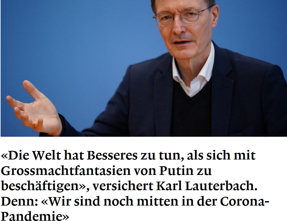 Da hat Putin die Corona ersetzt. Das erste Kriegsopfer war Klabauterbach. Der am ersten Tag nach Kriegsbeginn gekotzt, weil der Demiurg ihm die Show stiehlt